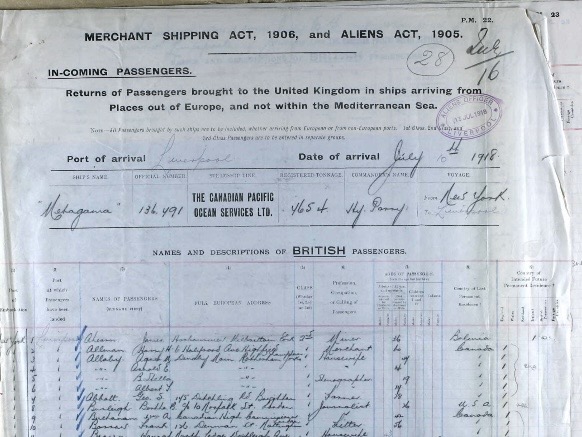 James Ahern left New York in the USA on the SS Metagama, a Transatlantic Ocean Liner Passenger ship of the Canadian Pacific Line; he disembarked on the 10th July 1918 at the Port of Liverpool. The passenger list gives his UK address as Harbour View, Kilbrittain, Cork, his parents’ family home in Ireland. He was 36, his profession stated that he was a Miner and his country of last permanent residence was Bolivia. His intended permanent future residence was stated as Ireland.