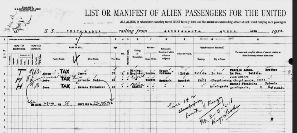 James Ahern embarked from Antofagasta, Chile, on the SS Kiyomaru, a Dry Cargo Ship that normally carried baled material and grain, and on this particular voyage, it also carried 3 foot passengers, including James Ahern. The ship left Antofagasta, Chile, on or about the 16th April 1918 and then presumably disembarked on the13th  May 1918 in San Francisco, California, USA, a 6,000-mile voyage that would take 30-40 days. The very short Passenger list of 3 people states that James’s Final Destination is Kilbrittain, Cork, Ireland. His details are as follows. Age 37 – Occupation – Mining Engineer, Able to Read & Write, his Nationality is stated as – Great Britain, but his Race is Irish, his last Permanent Residence was La Paz, Bolivia. It is also stated that his brother Patrick Ahern (Uncle Pad?) is/was in La Paz, Bolivia. Is this statement correct about his brother? I never knew that his Brother Uncle Pad was ever in Bolivia?!  In possession of £50 or less? Yes £51. Visited USA before? Yes New York 1911. Address in San Francisco – Hotel Le Esterhazy? 785 Broadway D1. This handwritten address was difficult to transcribe & it appears that this Hotel no longer exists.