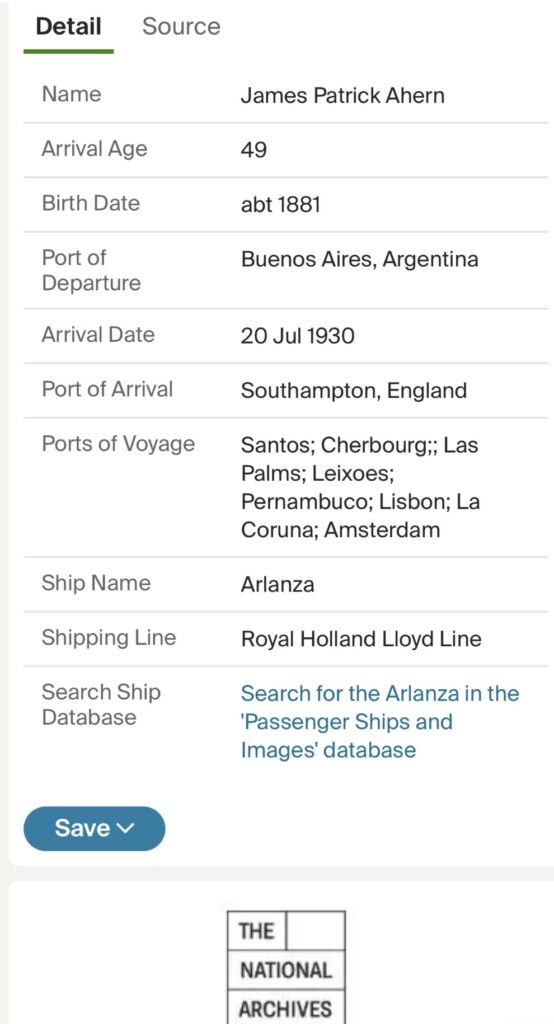 We are fairly certain that Uncle Jim was in Ireland in 1921, but as yet, I have found no travel record of Uncle Jim c 1919 to 1921.