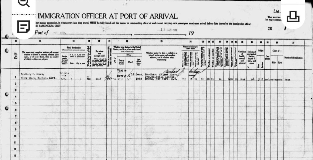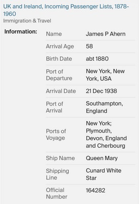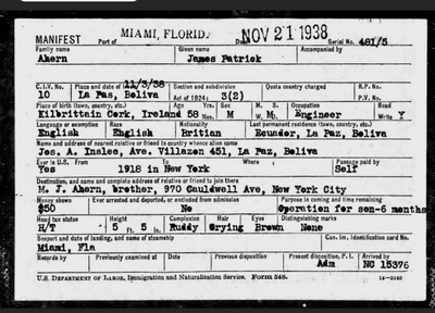 Prior to James Ahern embarking from New York, USA, on the Queen Mary Liner for the UK in December 1938, he presumably left La Paz, Bolivia, probably by Rail and sea. A journey of about 14 days and about 4,000 miles distant. On the 21st November 1938, he arrived in Miami-Dade, Florida, USA, travelling with his 3-year-old son John Ahern. Then on the 22nd November 1938, he was  Resident at 970 Cauldwell Avenue, Bronx, New York City, USA – Living in the family home of his brother Michael Ahern. James then stayed in New York with his 3-year-old son John, living with his brother Michael for about 3 weeks before embarking for the UK on the 15th December 1938.