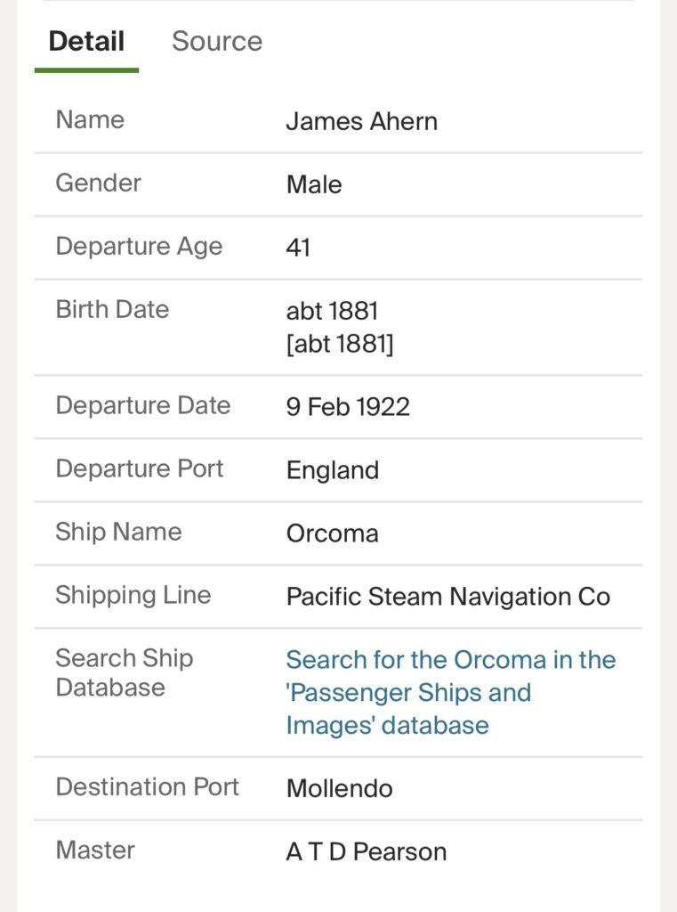 Uncle Jim’s details taken from the Passenger list are as follows: his last address in the United Kingdom was Harbour View, Kilbrittain, Co Cork. Travelling 2nd Class. Landing, Port Mollendo, Peru, Occupation Miner. Age 41. Country of intended future residence: Bolivia.