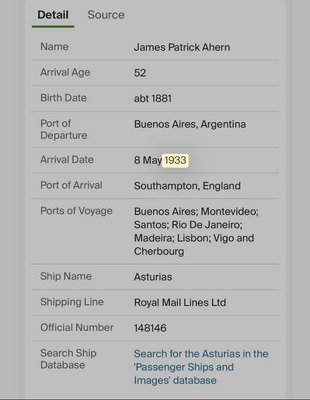 Copies of the Passenger lists with James Patrick Ahern & Quiroga Francisco (Panchito), their names and details of their Journey on the RMS Asturias in 1933 appear below. These passenger sheets do not reproduce very well.